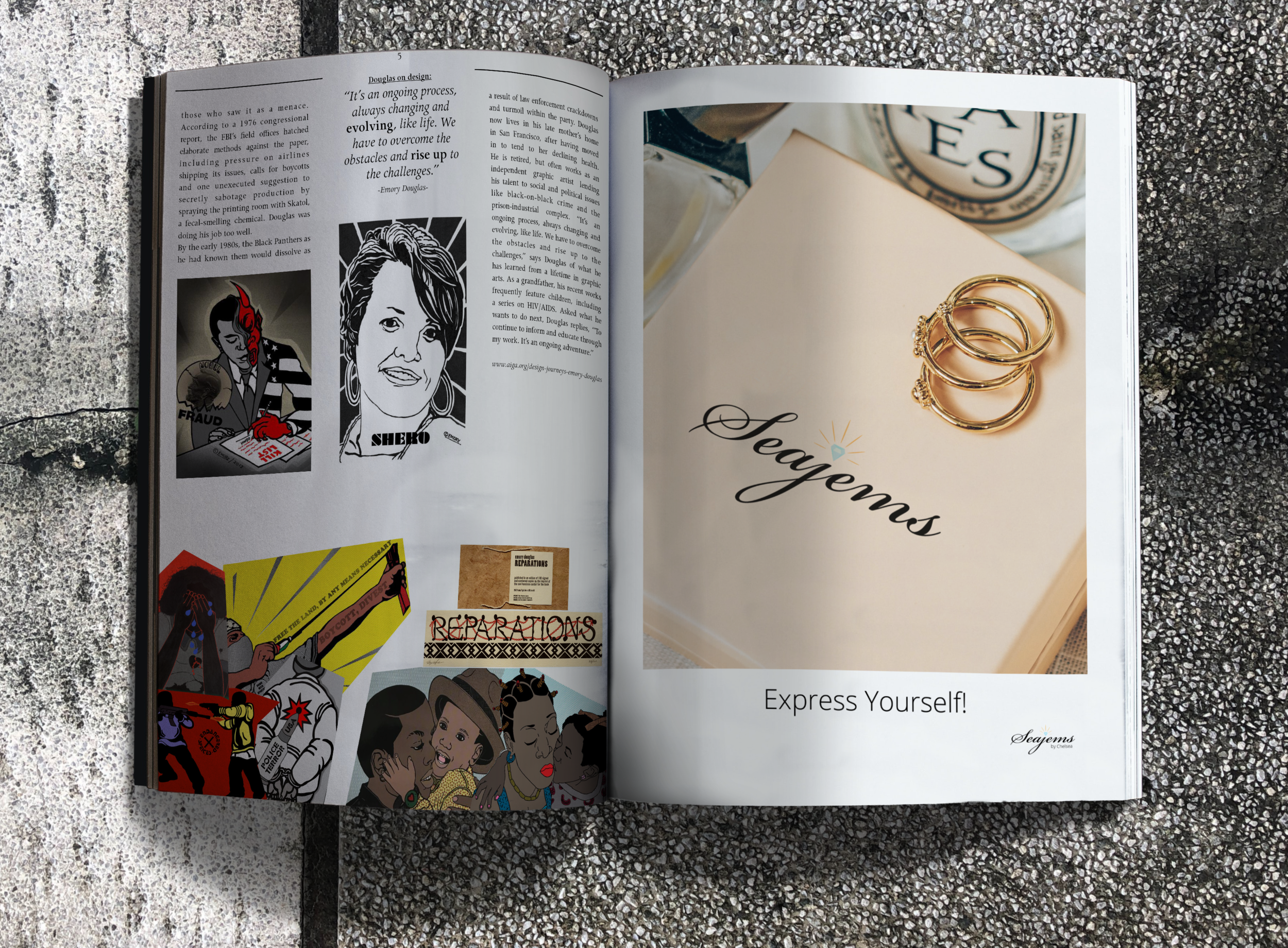 Design a 3 page (minimum) editorial layout for a magazine.